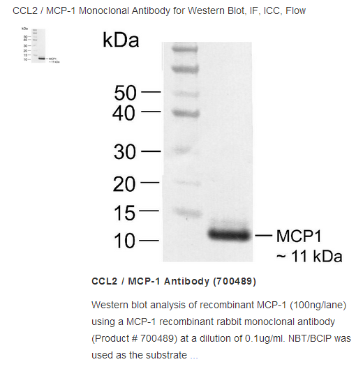 Monocyte chemotactic protein-1 (MCP-1) also known as CCL2 has a predicted molecular weight of ~11kDa; however, it may run at a higher molecular weight due to post translational modifications such as glycosylation. MCP-1 is a member of cytokine family and plays an important role in immunoregulation and inflammatory processes. MCP-1 is indicated in the etiology of several immune disorders. MCP-1 is also linked with tumor progression and related angiogenesis. MCP-1 displays selective chemotactic activity towards monocytes and basophils but not neutrophils or eosinophils. MCP-1 binds to chemokine receptors CCR2 and CCR4.