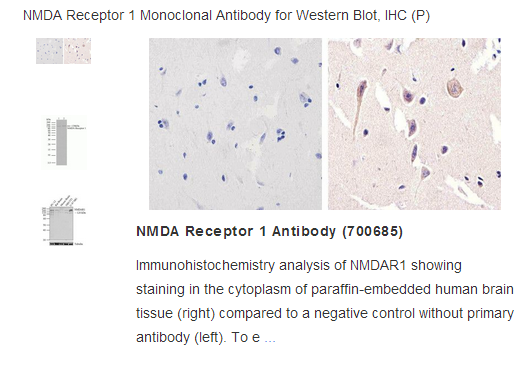 NMDA Receptor 1 (N-methyl-D-aspartate receptor 1) which belongs to the glutamate receptor channel superfamily, in humans is encoded by gene GRIN1 (Glutamate [NMDA] receptor subunit zeta-1) located on chromosome 9q34.3. Different NRI subunits are expressed by splicing of the GRINI gene sequence. Glutamate receptors are highly permeable to Ca+, important for controlling plasticity, memory and learning. NMDA receptors are important for the functioning of the nervous system.