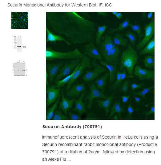 Pituitary tumor-transforming gene 1 (PTTG-1) is an oncogene expressed in normal tissues containing proliferating cells and in tumors. PTTG is downstream of the MAP kinase signaling cascade and is phosphorylated at Ser162 by MAPK in vitro. Phosphorylation plays an essential role in PTTG's transactivation function. The PTTG protein contains a DNA-binding domain, and it activates transcription of the c-Myc oncogene by binding to the promoter to form a complex. Studies have demonstrated that expression of human PTTG correlates with cell proliferation in a cell cycledependent manner, and the association of human PTTG with Ku, the regulatory subunit of DNA-dependent protein kinase, is disrupted when a DNA double-strand breaks occurs.