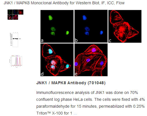 C-Jun N-terminal Kinase (JNK) is also known as Mitogen-activated protein kinase (MAPK8). It belongs to the MAPK superfamily of stress-activated protein kinases. MAPKs are Serine-threonine protein kinases that are activated in response to a variety of extracellular stimuli, and mediate signal transduction from the cell surface to the nucleus. JNK is involved in a wide variety of cellular processes such as proliferation, differentiation, transcription regulation and development. JNK pathways are activated by stress and inflammatory signals. JNK is expressed as ten different isoforms due to differential mRNA splicing. The predominant forms are JNK1 and JNK2.