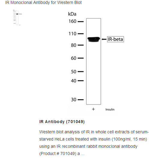 Insulin receptor (IR), belongs to the growth factor receptor tyrosine kinase superfamily which regulates multiple signaling pathways. It is a heterotetrameric membrane glycoprotein consisting of alpha and beta subunits encoded by the INSR gene in humans. IR and IGF-1 receptors share major structural and functional similarity. The earliest cellular response to insulin stimulation is autophosphorylation of tyrosine in IR. In humans, the IR gene is located on chromosome 19.