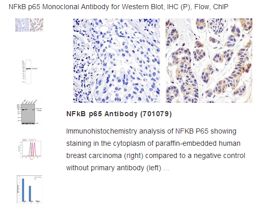 NF kappaB p65 belongs to the Rel family of transcription factors. NF kappaB homo and heterodimers are retained in an inert, non-DNA-binding form in the cytosol by inhibitory molecules in most cells. Activation of NF kappaB occurs predominantly through the phosphorylation and degradation of I kappaB proteins. The free NF kappaB translocates to the nucleus, where it upregulates expression from genes involved in developmental processes, cellular growth, apoptosis, and immune and inflammatory responses. In humans, the gene is located on the q arm of chromosome 11.