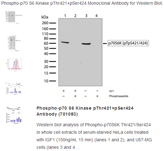 p70 Ribosomal Protein S6 Kinase (p70S6K) is a 70 kDa member of the ribosomal S6 kinase (RSK) family of serine/threonine kinases. It is predominantly localized in the cytoplasm, and is essential in growth factors regulated cell proliferation, pathways involving cell motility, such as metastases, the immune response, and tissue repair. p70S6K acts downstream of phosphoinositide (PI) 3-kinase, and its main physiological target is the S6 ribosomal protein, which is involved in upregulation of protein synthesis.