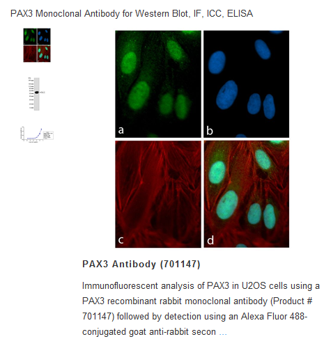 Pax 3 (Paired Box 3) is a transcription factor that is involved in development of the peripheral nervous system, melanocytes, some vascular smooth muscle, and a number of other derivatives. It regulates neurogenesis in pre-migratory neural crest cells from the dorsal neural tube, and in myogenic progenitors in the presomitic mesoderm and the hypaxial somites. Alternative splicing results in isoforms having different C-termini.