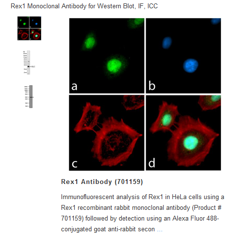 Rex1 is an exonuclease domain-containing transcription factor protein that can bind to Elongin. The Elongin complex stimulates the rate of transcription elongation by RNA polymerase II through suppression of transient pauses of the polymerase at various sites along the DNA template. Rex1 is a putative stem cell marker that is highly expressed in embryonic and adult stem cells.