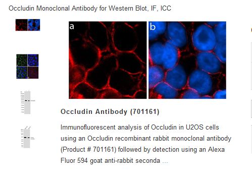 Tight junction group of proteins are a cell-to-cell adhesion structure in epithelial cells that constitute the epithelial junctional complex with adherens junctions and desmosomes. Tight junction strands are mainly composed of claudins, occludin, and JAM. Occludin is a 65 kDa protein and is considered to be vital in the assembly and maintenance of tight junctions. At the tight junction, occludin associates with membrane peripheral protein ZO-1. The expression of occludin varies greatly on the type of tissue. It is continuously and highly expressed in brain whereas non-neural tissues show lower expression and discontinuous distribution. Overall structural features of the occludin protein are highly conserved in all the species examined. Under-expression of tight junction proteins, including occludin, is a key molecular abnormality responsible for the increased permeability of tumor endothelial tight junctions, which contributes to brain tumor edemas