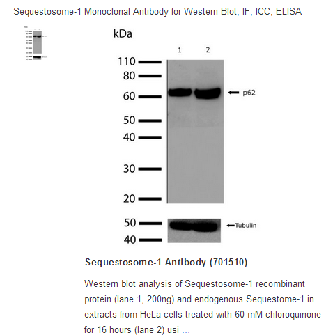p62 is a scaffold protein which plays an important role in autophagy by acting a link in recognizing ubiquinated targets and presenting them to autophagic machinery. The N-terminus of p62 aids in polymerization, while the C-terminus aids in binding to ubiquinated proteins and to autophagosomal proteins like LC3. p62 is ubiquitously expressed in adult tissues. It co-localizes with ubiquinated proteins in protein bodies found in the cytosol and nucleus, or within autophagosomes and lysosomal structures.