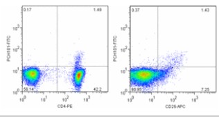 The PCH101 antibody reacts with the amino terminus of human foxp3 protein also known as FORKHEAD BOX P3, SCURFIN, and JM2; cross reactivity of this antibody to other proteins has not been determined. Foxp3, a 49-55 kDa protein, is a member of the forkhead/winged-helix family of transcriptional regulators, and was identified as the gene defective in ‘scurfy’ (sf) mice. Constitutive high expression of Foxp3 mRNA has been shown in CD4+CD25+ regulatory T cells (Treg cells), and ectopic expression of foxp3 in CD4+CD25- cells imparts a Treg phenotype in these cells.