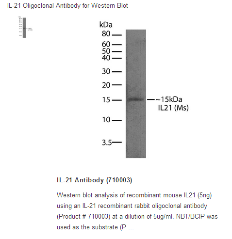 IL21 is a 15 kDa protein and is a potent factor for naive B cells. IL21 and its receptor IL21R are connected to natural killer cell expansion and regulate lymphocyte function. IL21 is known to inhibit dendritic cell activation and maturation. IL21 and IL21R are known to activate JAK/STAT pathway and have been connected to cancer and autoimmunity. IL21 plays an important role in immunoglobulin production.