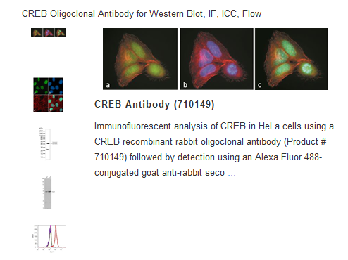 CREB (cAMP responsive element binding protein) encodes for a 43 kDa protein transcription factor and belongs to leucine zipper family. CREB binds to the cyclic-AMP response element (CRE, a sequence present in many viral and cellular promoters) as a homodimer. Phosphorylated form of CREB act as an inducer of transcription for the genes, upon hormone dependent stimulation of cyclic-AMP pathway. CREB is known to play important role in circadian rythm generation and memory formation; aberration in CREB-mediated gene expression has been linked with Alzheimer disease. In humans, the gene is located on the q arm of chromosome 2.