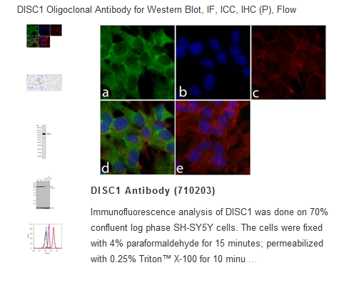 DISC1 (Disrupted in Schizophrenia 1) is a multifunctional protein that interacts with multiple proteins of the centrosome and cytoskeletal system, and is involved in neuronal functions that are dependent upon proper cytoskeletal regulation, including neuronal migration, neurite architecture and intracellular transport. Regions of the brain which express DISC1 include the hippocampus, lateral septum, amygdala, cerebral cortex, cerebellum and paraventricular hypothalamus, and loss of DISC1 function results in differences in structural organization.