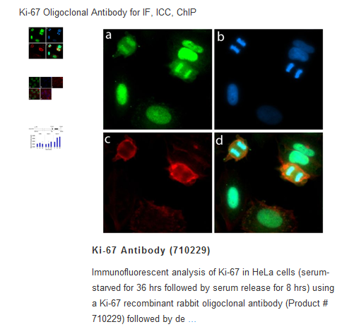 Ki-67 is a nuclear protein that is expressed during various stages in the cell cycle, particularly during late G1, S, G2, and M phases. The protein has a forkhead associated domain (FHA) through which it associates with the euchromatin at the perichromosomal layer with centromeric heterochromatin, and with the nucleolus. Ki-67 is shown to have a cell cycle dependent topographical distribution, with perinucleolar expression at G1, expression in the nuclear matrix at G2, and expression on the chromosomes during M phase. Ki-67 is commonly used as a proliferation marker because it is not detected in G0 cells, but increases steadily from G1 through mitosis.