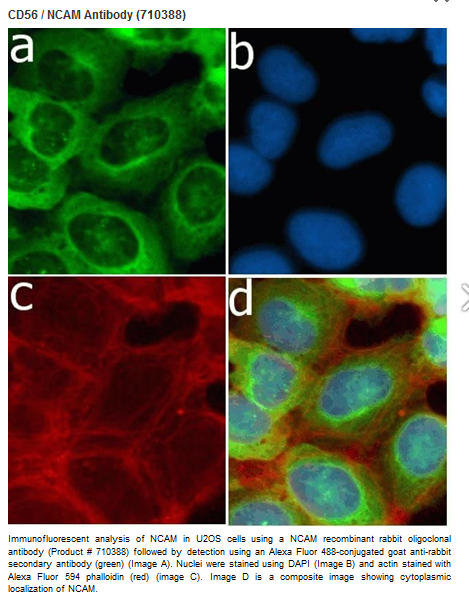 The neural cell adhesion molecule (NCAM) is a member of the Ig superfamily, and is involved in mediating homophilic binding. A number of different isoforms of NCAM exist. The isoforms are differentially expressed depending upon tissue type, and stage of development. In addition to playing a role in cell-cell adhesion, NCAM is also involved in development, neurite outgrowth, synaptic plasticity, learning, and memory.