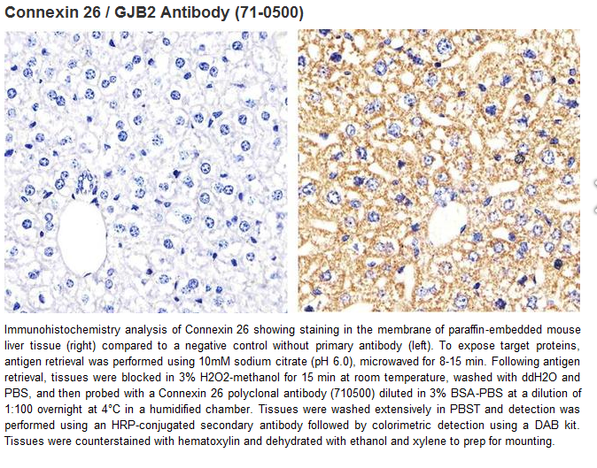71-0500 was used in the immunofluorescence and western blot analysis to successfully detect Connexin26 in mouse liver sections and homogenate, respectively.