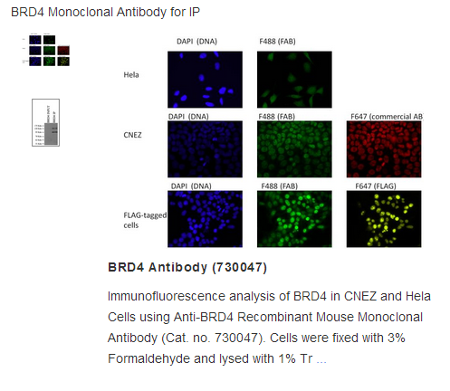 BRD4, a ubiquitously expressed nuclear phosphoprotein, is a member of BET protein family. It is a human homolog of mouse MCAP and consists of 2 N-terminal bromodomains, a central ET-domain, and several kinase-like motifs in its N-terminus. It is expressed as 2 isoforms; longer variant has a C-terminus region with a praline and glutamine-rich domains. BRD4 is a chromatin-binding protein whose expression is induced in response to growth stimuli. BRD4 acts at different stages of cell cycle by interacting with proteins including RFC and SPA-1 and regulates cell growth. It also has a role in regulating chromosomal dynamics during mitosis. BRD4 functions as a cellular target for E2 protein of papillomavirus.
