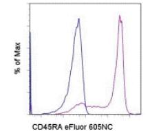 Description: The HI100 monoclonal antibody reacts with human CD45RA, a 220 kDa molecule expressed by subpopulations of CD4+ peripheral T lymphocytes, CD8+ peripheral T lymphocytes, and B cells. The CD45RA+ T cell populations are mainly naive/virgin allowing the use of HI100 mAb as a phenotypic marker to discriminate T cell subsets.