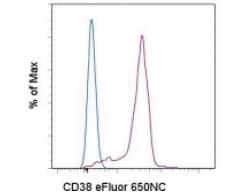 Description: The HB7 monoclonal antibody reacts with the human CD38 molecule, an approximately 45 kDa type II transmembrane protein. CD38 is an ectoenzyme which catalyses NAD into nicotinic acid adenine dinucleotide phosphate (NAADP) and cyclic ADP-ribose (cADPR), both of which are secondary messengers. Expression of CD38 is bimodal during B cell development, modulating from high in immature cells to low in intermediate ones and back to high on mature B cells. Additionally CD38 is found in a variety of tissues and other hematopoietic cells (e.g. T cells, NK cells and monocytes) and can be used to phenotype leukemias and monitor HIV-1 progression. The CD34+CD38- population of hematopoietic stems cells is thought to define the most pluripotent cells (e.g. blast colony forming cells). In addition to surface expression, CD38 has recently been found in the nucleus where it may play a role in monitoring calcium levels.