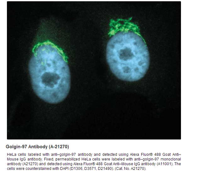 The anti-golgi antibody, anti-human golgin-97 mouse monoclonal antibody CDF4, isotype IgG1,k recognizes a 97,000-dalton protein called golgin-97, a member of the granin family of proteins and a peripheral membrane protein localized on the cytoplasmic face of the Golgi apparatus. Because the antibody recognizes a protein unique to the Golgi apparatus of most vertebrate species, it is useful for immunodetection and identification of the Golgi apparatus in cells, western blotting and immunoprecipitation.