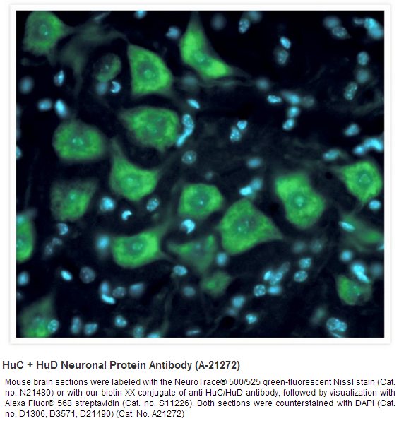 Anti-Hu antibodies were originally isolated from a patient with paraneoplastic encephalomyelitis, a rare condition of selective neural tissue injury associated with small cell lung carcinoma. The antibodies bind specifically to antigens present exclusively in neuronal cells and are thus useful as markers of neuronal cells in tissue. The Hu antigen is an RNA-binding protein of the embryonic lethal abnormal visual (Elav) family.