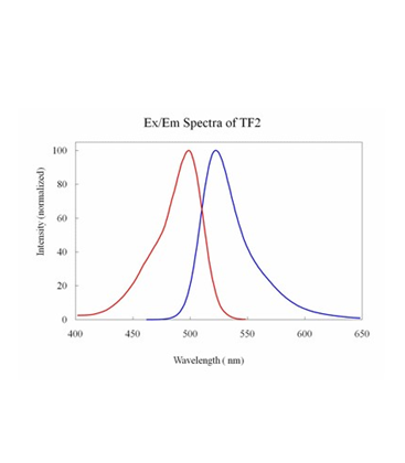 Tide Fluor™ 2 (TF2) family has the spectral properties similar to those of fluoresceins and Alexa Fluor® 488 (Alexa Fluor® is the trademark of Invitrogen). Compared to fluoresceins TF2 family has much stronger fluorescence and higher photostability. Additionally their fluorescence is pH-independent from pH 3 to 11. These characteristics make this new dye family a superior alternative to fluoresceins. TF2-labeled peptides and nucleotides exhibit much stronger fluorescence and higher photostability than the ones labeled with FITC or FAM. In pairing with our Tide Quencher™ 2 (TQ2), a variety of FRET peptides and nucleotides can be developed for detecting proteases and molecular beacons with enhanced sensitivity and stability. In addition, TF2 has spectral properties, pH dependence and photostability similar to Alexa Fluor® 488, making them excellent replacement to the expensive Alexa Fluor® 488.