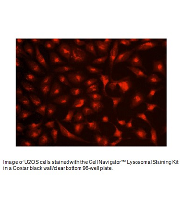 Lysosomes are cellular organelles which contain acid hydrolase enzymes to break up waste materials and cellular debris. Lysosomes digest excess or worn-out organelles, food particles, and engulfed viruses or bacteria. The membrane around a lysosome allows the digestive enzymes to work at pH 4.5. The interior of the lysosomes is acidic (pH 4.5-4.8) compared to the slightly alkaline cytosol (pH 7.2). The lysosome maintains this pH differential by pumping protons from the cytosol across the membrane via proton pumps and chloride ion channels. Our Cell Navigator™ fluorescence imaging kits are a set of fluorescence imaging tools for labeling sub-cellular organelles such as membranes, lysosomes, mitochondria, nuclei, etc. The selective labeling of live cell compartments provides a powerful method for studying cellular events in a spatial and temporal context. This particular kit is designed to label lysosomes of live cells in orange fluorescence at Ex/Em = 575/597 nm. LysoBrite™ Red, the proprietary lysotropic dye used in the kit, selectively accumulates in lysosomes probably via the lysosome pH gradient. The lysotropic indicator is a hydrophobic compound that easily permeates intact live cells, and trapped in lysosomes after it gets into cells. Its fluorescence is significantly enhanced upon entering lysosomes. This key feature significantly reduces its staining background and makes it useful for a variety of studies, including cell adhesion, chemotaxis, multidrug resistance, cell viability, apoptosis and cytotoxicity. It is suitable for proliferating and non-proliferating cells, and can be used for both suspension and adherent cells. LysoBrite™ dyes significantly outperform the equivalent LysoTracker ™dyes (from Invitrogen). LysoBrite™ dyes can stay in live cells for more than a week with very minimal cell toxicity while the LysoTracker dyes can only be used for a few hours. LysoBrite™ dyes are fixable, and can survive a few generations of cell division. In addition, LysoBrite™ dyes are much more photostable than the LysoTracker dyes.