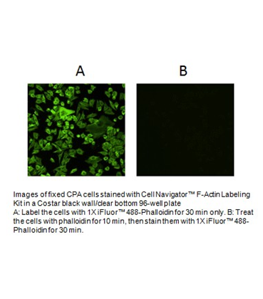 Our Cell Navigator™ fluorescence imaging kits are a set of fluorescence imaging tools for labeling sub-cellular organelles such as membranes, lysosomes, mitochondria and nuclei etc. The selective labeling of live cell compartments provides a powerful method for studying cellular events in a spatial and temporal context. This particular kit is designed to label F-actins of fixed cells in green fluorescence. The kit uses a green fluorescent phalloidin conjugate that is selectively bound to F-actins. This green fluorescent phalloidin conjugate is a high-affinity probe for F-actins with much higher photostability than the fluorescein-phalloidin conjugates. Used at nanomolar concentrations, phallotoxins are convenient probes for labeling, identifying and quantitating F-actins in formaldehyde-fixed and permeabilized tissue sections, cell cultures or cell-free experiments. The labeling protocol is robust, requiring minimal hands-on time. The kit provides all the essential components with an optimized staining protocol.