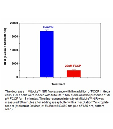 Our Cell Meter™ assay kits are a set of tools for monitoring cell viability. There are a variety of parameters that can be used for monitoring cell viability. This particular kit is designed to monitor cell apoptosis through measuring the loss of the mitochondrial membrane potential. The collapse of mitochondrial membrane potential coincides with the opening of the mitochondrial permeability transition pores, leading to the release of cytochrome C into the cytosol, which in turn triggers other downstream events in the apoptotic cascade. Our Cell Meter™ NIR Mitochondria Membrane Potential Detection Kit provides all the essential components with an optimized assay method for the detection of apoptosis in cells with the loss of mitochondrial membrane potential. This fluorometric assay is based on the detection of the mitochondrial membrane potential in cells by our proprietary cationic MitoLite NIR™ dye. In normal cells, MitoLite NIR™ accumulates primarily in mitochondria, however, in apoptotic cells, MitoLite NIR™ staining intensity decreases. Cells stained with MitoLite NIR™ can be monitored fluorimetrically at 660-680 nm with excitation of 620-640 nm. The kit can be used for screening of apoptosis activators and inhibitors. The assay can be performed in a convenient 96-well and 384-well fluorescence microtiter-plate format.