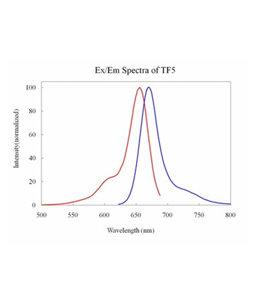 Tide Fluor™ 5 (TF5) family has the spectral properties essentially identical to those of Cy5. Compared to Cy5 probes TF5 family has much stronger fluorescence and higher photostability. Additionally their fluorescence is pH-independent from pH 3 to 11. These characteristics make this new dye family a superior alternative to Cy5. TF5-labeled peptides and nucleotides exhibit much stronger fluorescence and higher photostability than the ones labeled with Cy5. In pairing with our Tide Quencher™ 5 (TQ5), a variety of FRET peptides and nucleotides can be developed for detecting proteases and molecular beacons with enhanced sensitivity and stability.