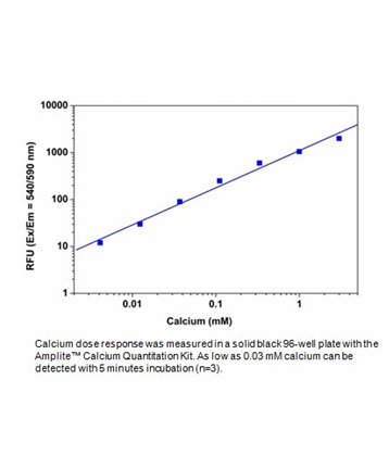 钙离子对所有的生命有机体都非常重要,特别是细胞的生理活性,钙离子Ca2+从哪里进出细胞质是许多细胞生命活动的功能信号。钙离子是人体内聚集的排在第五的大量元素;它通常是细胞中带有多种功能的离子型信使,也是结构骨架的重要元素。钙离子在介导血管的紧缩和松弛,神经冲动传递,肌肉收缩和激素分泌中发挥重要的作用。在人体中,血清中钙离子水平在调节在一个相对限制性的范围(9 到10·5 mg/dL)。低钙血症和高钙血症都是很严重的医学病症。造成钙离子水平过低的原因包括:慢性肾功能衰竭、微生物D缺乏、血液中镁离子水平过低,这些都可以再严重的酒精中毒中发生。Amplite钙离子检测试剂盒使用我们所专有的红色荧光探针,为生理溶液中钙离子检测提供了一种简单的测定方法。这种荧光信号可以很容易地通过荧光分析仪读取,Ex/Em = 540 /590 nm的值。Amplite钙离子检测试剂盒可以便捷地用于96或384微孔板分析中,并且不需要任何分拣步骤就可以容易地实现自动化。本检测方法可以在30分钟内完成,使用Amplite钙离子检测试剂盒,我们可以检测到浓度低至0·03 mM的钙离子。