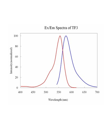 FMOC-Lys(TF3)-OH是TF3按序标记天冬氨酸的基础。TF3具有与Cy3相同的光谱特征。与Cy3相比,TF3在酸性和在基本的脱保护条件下更加稳定。我们所提供的TF3比Cy3标记的多肽和寡核苷酸具有更强的荧光。TF3标记的Lys赖氨酸产品的光谱学相关参数为Ex=554nm / Em=583nm;其对应分子量大小为808.92MW。