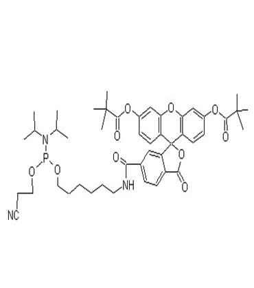 有许多方法标记寡聚核苷酸,使其带有荧光。依据其光谱需求,标记的选择多元化。5’荧光-CE-亚磷酰胺,来源于6-羧基荧光素单一异构体。5’-六氯荧光素氨基磷酸酯(HEX)和5‘-四氯荧光素氨基磷酸酯。6-FAM亚磷酰胺[5’-荧光素氨基磷酸酯]产品的光谱学相关参数为Ex=494nm / Em=522nm;其对应分子量大小为843.94MW。