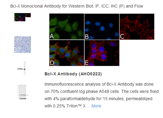 This antibody reacts with both Bcl-XS (short) and Bcl-XL (long) proteins. The immunogenic sequence (aa 3-14) is conserved in human and mice.