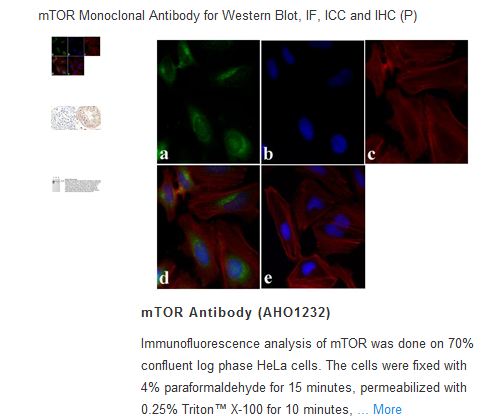 Mammalian target of rapamycin (mTOR) is a serine/threonine kinase that plays a key role in cell growth, cell proliferation, and protein synthesis. mTOR mediates phosphoinositide 3-kinase and Akt/PKB signaling, resulting in phosphorylation of 4EBP1, and initiation of mRNA translation. A second pathway involves regulation of ribosomal S6 kinase, which affects ribosome biogenesis and translation elongation.