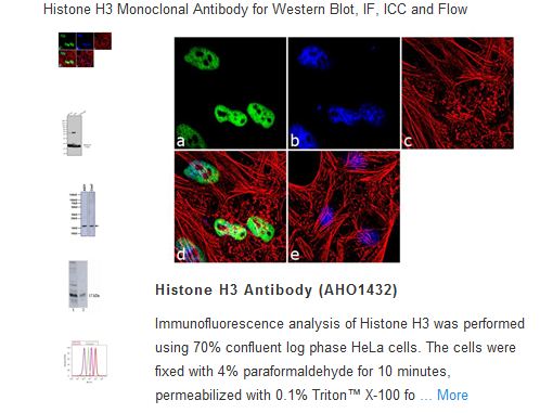Histone H3 is one of the DNA-binding proteins found in the chromatin of all eukaryotic cells. H3 along with four core histone proteins binds to DNA forming the structure of the nucleosome. Histones play a central role in transcription regulation, DNA repair, DNA replication and chromosomal stability. Post tranlationally, histones are modified in a variety of ways to either directly change the chromatin structure or allow for the binding of specific transcription factors. The N-terminal tail of histone H3 protrudes from the globular nucleosome core and can undergo several different types of post-translational modification that influence cellular processes. These modifications include the covalent attachment of methyl or acetyl groups to lysine and arginine amino acids and the phosphorylation of serine or threonine.