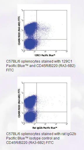 ** Pacific Blue™ is a registered trademark of Molecular Probes, Inc. Pacific Blue™ dye antibody conjugates are sold under license from Molecular Probes, Inc. for research use only, except for use in combination with microarrays and high content screening, and are covered by pending and issued patents.