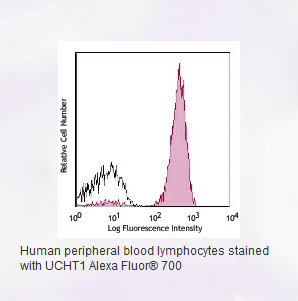 * Alexa Fluor® 700 has a maximum emission of 719 nm when it is excited at 633 nm / 635 nm. Prior to using Alexa Fluor® 700 conjugate for flow cytometric analysis, please verify your flow cytometer's capability of exciting and detecting the fluorochrome.