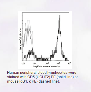 Each lot of this antibody is quality control tested by immunofluorescent staining with flow cytometric analysis. Test size products are transitioning from 20 µl to 5 µl per test. Please check your vial or your CoA to find the suggested use of this reagent per million cells in 100 µl staining volume or per 100 µl of whole blood. It is recommended that the reagent be titrated for optimal performance for each application.