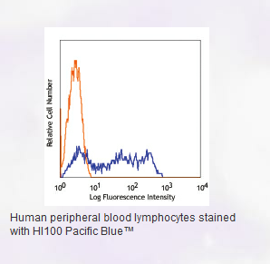 * Pacific Blue™ has a maximum emission of 455 nm when it is excited at 405 nm. Prior to using Pacific Blue™ conjugate for flow cytometric analysis, please verify your flow cytometer's capability of exciting and detecting the fluorochrome.