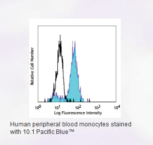 * Pacific Blue™ has a maximum emission of 455 nm when it is excited at 405 nm. Prior to using Pacific Blue™ conjugate for flow cytometric analysis, please verify your flow cytometer's capability of exciting and detecting the fluorochrome.