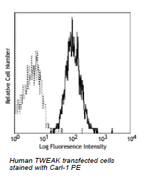TNF-like weak inducer of apoptosis (TWEAK) is a type II transmembrane TNF superfamily member with strong homology to TNF in its extracellular portion, though less potent in inducing apoptosis. It has been clustered as CD255. TWEAK transcript is expressed broadly in many adult and fetal tissues; however, the staining of human peripheral blood mononuclear cells with TWEAK-specific antibodies shows a more restricted pattern. TWEAK is expressed as membrane-bound and secreted forms. Interaction of TWEAK with its receptors (DR3, Fn14) promotes secretion of IL-8, activation of NF-kB, proliferation of endothelial cells, and apoptosis in a number of human cell lines.