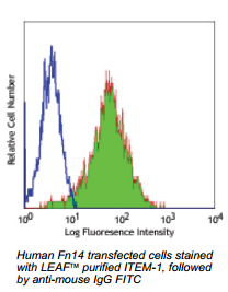 TWEAK receptor is also known as fibroblast growth factor inducible 14 kD protein (Fn14) or CD266. It is a 14 kD transmembrane protein that is expressed on a variety of tissue types. This receptor binds TWEAK and interacts with the cytoplasmic proteins TRAF1, 2, and 3. The TWEAK receptor is rapidly induced during liver regeneration and m play a role in hepatocyte growth. TWEAK receptor engagement can induce cell death and may play a role in inflammation. The ITEM-1 antibody is useful for flow cytometric analysis, induction of tumor cells apoptosis or necrotic cell death, enhancing endothelial cell proliferation, and immunohistochemistry on frozen tissues.