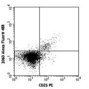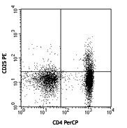 T regulatory (Treg) cells are a subset of T lymphocytes which is characterized by CD4+/CD25+/FOXP3+. These naturally occurring Treg cells originate in the thymus, and comprise 2-10% of peripheral CD4+ T cells. It has been shown that Treg cells are able to inhibit T cells proliferation and cytokine production and play critical roles in preventing autoimmunity as well as in controlling tumor immunity and transplantation tolerance. Impaired Treg function or Treg cell deficiency will develop variety of autoimmune diseases, while higher frequency of Treg cells will cause hypo-immune response to pathogens. BioLegend's One Step Staining Human Treg FlowTM Kit is designed and formulated specifically for immunofluroscence staining and flow cytometric analysis of human Treg cells in a mixed lymphocyte population. This kit is composed of flurochrome conjugated anti-human CD4, CD25 and FOXP3 antibodies and the critical buffers. It is an one-step staining kit for labeling both surface and intracellular antigens of Treg cells.