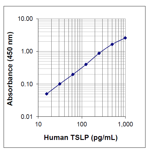 Human TSLP (Thymic Stromal Lymphopoietin) is a hemopoietic protein that is expressed in the heart, liver and prostate. TSLP overlaps its biological activities with IL-7 and binds with the heterodimeric receptor complex consisting of the IL-7R alpha chain (IL-7Rα) and the TSLP-specific chain (TSLPR). TSLP is produced mainly by non-hematopoietic cells such as fibroblasts, epithelial cells and stromal or stromal-like cells. Human TSLP impacts myeloid cells and induces the release of T cell-attracting chemokines from monocytes and enhances the maturation of CD11c+ dendritic cells. TSLP activated dendritic cells prime naïve T cells to a TH2 phenotype, which are strong producers of cytokines IL-13, IL-5, and TNF-α. TSLP also directly stimulates the production of TH2 cytokines by human mast cells. Finally, expression of TSLP has been linked to the pathogenesis of allergic inflammation such as atopic dermatitis and asthma via activating dendritic cells and mast cells that trigger an inflammatory TH2 response.