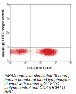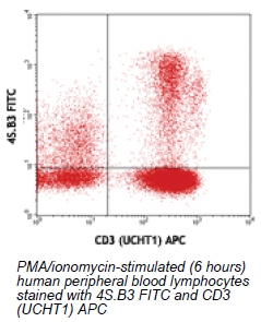 Each lot of this antibody is quality control tested by intracellular immunofluorescent staining with flow cytometric analysis. Test size products are transitioning from 20 μl to 5 μl per test. Please check your vial or your CoA to find the suggested use of this reagent per million cells in 100 μl staining volume or per 100 μl of whole blood. It is recommended that the reagent be titrated for optimal performance for each application.