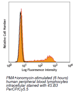Each lot of this antibody is quality control tested by intracellular immunofluorescent staining with flow cytometric analysis. For immunofluorescent staining, the suggested use of this reagent is 5 μl per million cells or 5 μl per 100 μl of whole blood. It is recommended that the reagent be titrated for optimal performance for each application.