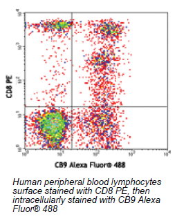 Each lot of this antibody is quality control tested by intracellular immunofluorescent staining with flow cytometric analysis. For immunofluorescent staining, the suggested use of this reagent is 5 μl per million cells or 5 μl per 100 μl of whole blood. It is recommended that the reagent be titrated for optimal performance for each application.
