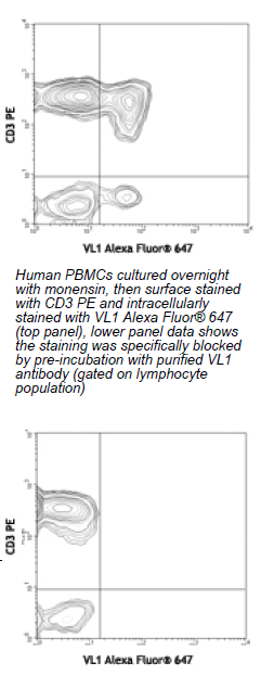 Each lot of this antibody is quality control tested by intracellular immunofluorescent staining with flow cytometric analysis. For immunofluorescent staining, the suggested use of this reagent is 5 μl per million cells or 5 μl per 100 μl of whole blood. It is recommended that the reagent be titrated for optimal performance for each application.