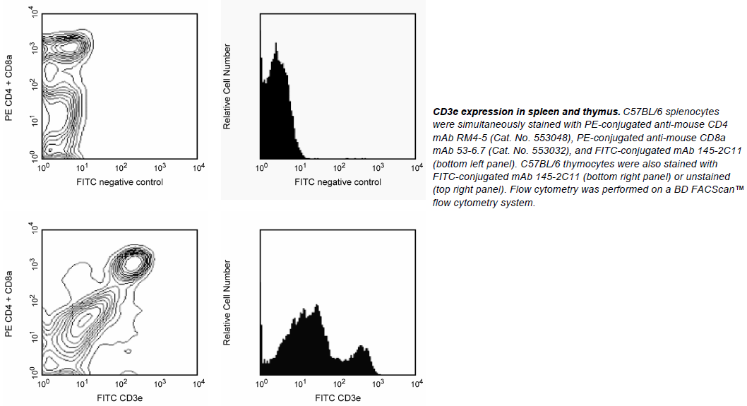 The 145-2C11 antibody reacts with the 25-kDa ε chain of the T-cell receptor-associated CD3 complex, which is expressed on thymocytes, mature T lymphocytes, and NK-T cells. The cytoplasmic domain of CD3e participates in the signal transduction events which activate several cellular biochemical pathways as a result of antigen recognition. Soluble 145-2C11 antibody can activate either unprimed (naive) or primed (memory/preactivated) T cells in vivo or in vitro, in the presence of Fc receptor-bearing accessory cells. In contrast, plate-bound 145-2C11 can activate T cells in the absence of accessory cells. Soluble 145-2C11 antibody has been reported to induce re-directed lysis of Fc receptor-bearing target cells by CTL clones and can also block lysis of specific target cells by antigen-specific CTL's. Under some conditions, T-cell activation by 145-2C11 antibody has been reported to result in apoptotic cell death. The 145-2C11 antibody does not cross-react with rat leukocytes and it has been reported that pre-incubation of thymus cell suspensions at 37°C for 2-4 hours prior to staining enhances the ability of anti-CD3ε and anti-αβ TCR mAbs to detect the T-cell receptor on immature thymocytes.