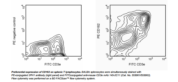 The 2PH1 antibody reacts with the N-terminus of CD162 (P-selectin glycoprotein ligand-1, PSGL-1), encoded by the Selpl gene. PSGL-1 is