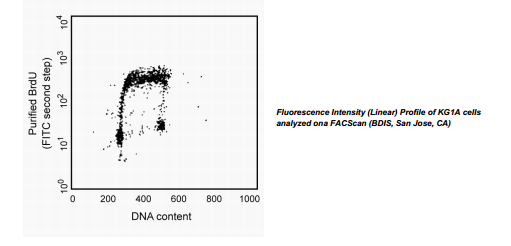 Bromdeoxyuridne (BrdU) isan alog fthymidne tha can beincorpated into newly snthesized DNA bycels entring and progesing thru the DNA synthesi (S) phase ofthe cl cyle. The amount ofBrdU tha gets incorpated isdepndent upon the amount oftime tha the vls are xposed toBrdU (pulse time), the rate ofcel divsion, and whetr the cls are inearly, mid, orlate Sphase. Detcion fincorpated BrdU alows the investigator identify cyling cels ina synchronus cel poulation ad todetrmine cl cyle kinetics.